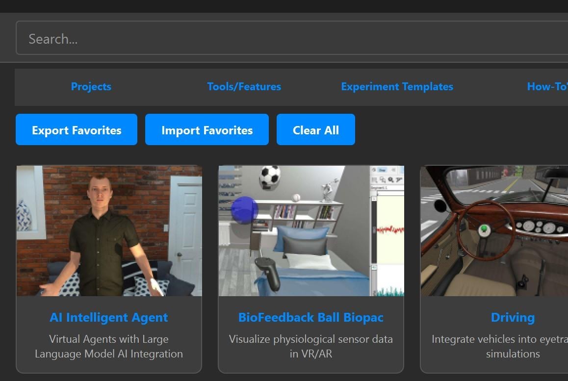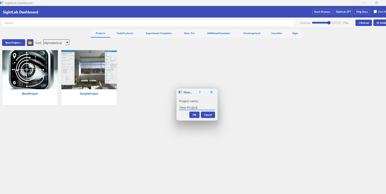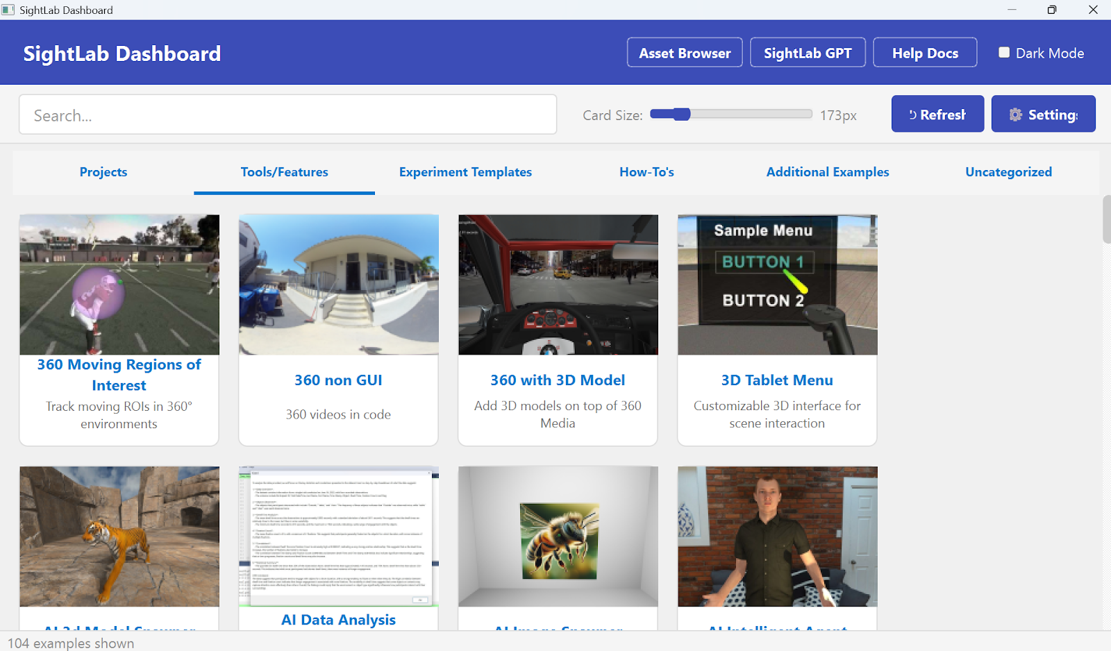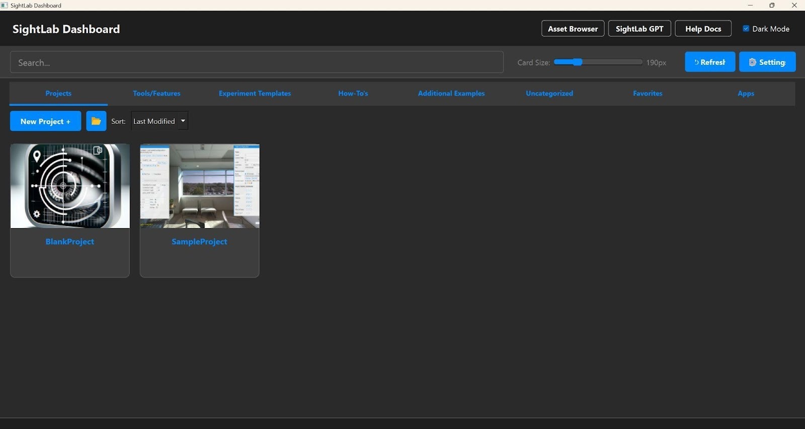The dashboard is organized into several tabs, each meant to help you find a different kind of content. The Projects tab shows your own SightLab projects (and create new ones), while Tools/Features, Experiment Templates, and Additional Examples help you browse built-in examples, sample workflows and more demos. There is also an Uncategorized tab for items that haven’t been assigned a category yet, a Favorites tab for items you want to save for quick access, and an Apps tab for launching external tools like Vizard and Inspector.