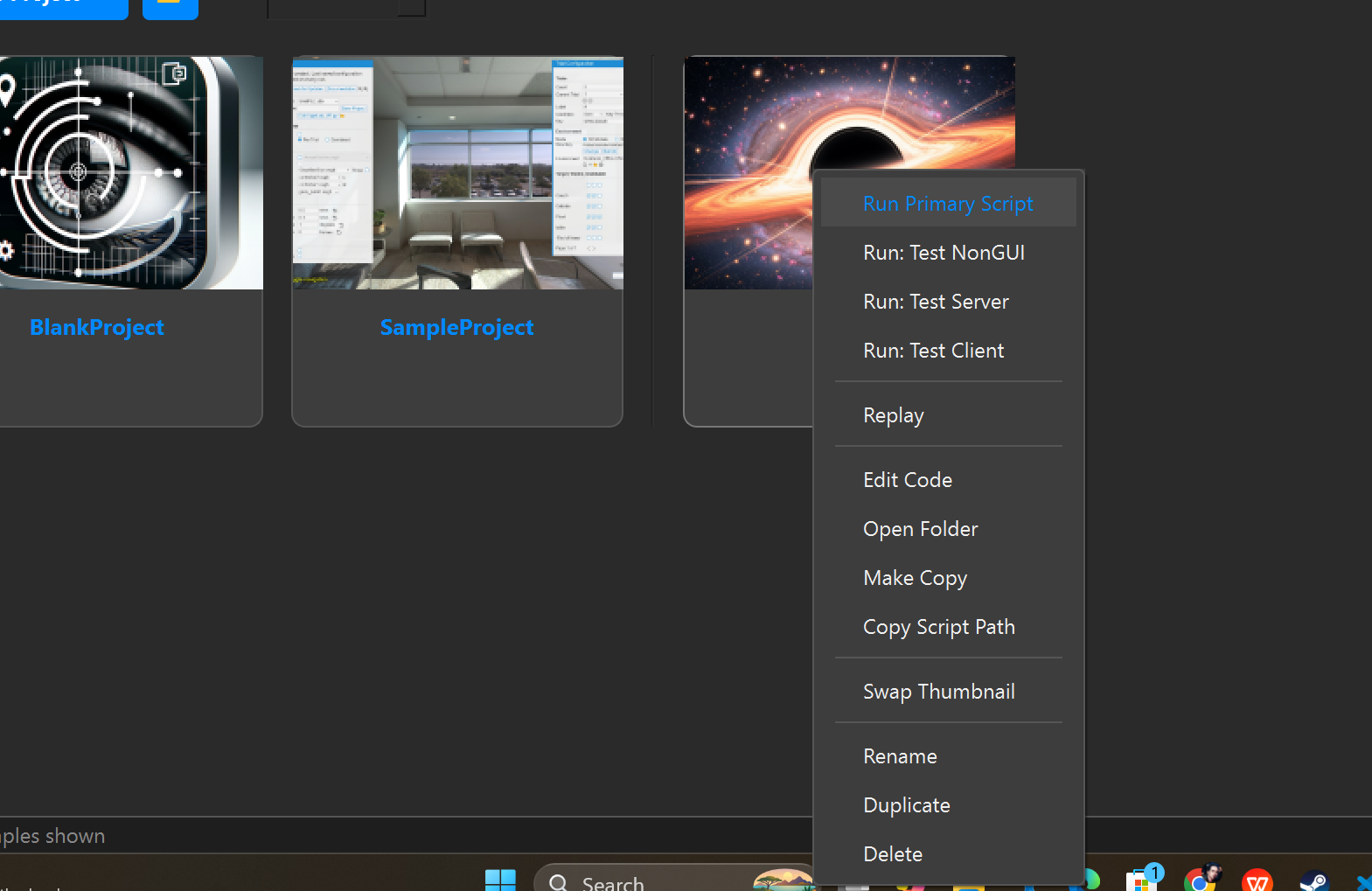 Right-clicking a card opens a context menu with quick actions. Depending on the item, you may be able to run the primary script, launch alternate scripts, replay a session, edit code, open the containing folder, make a copy, copy the script path, open documentation, or swap the thumbnail. Project cards may also allow rename, duplicate, and delete actions.