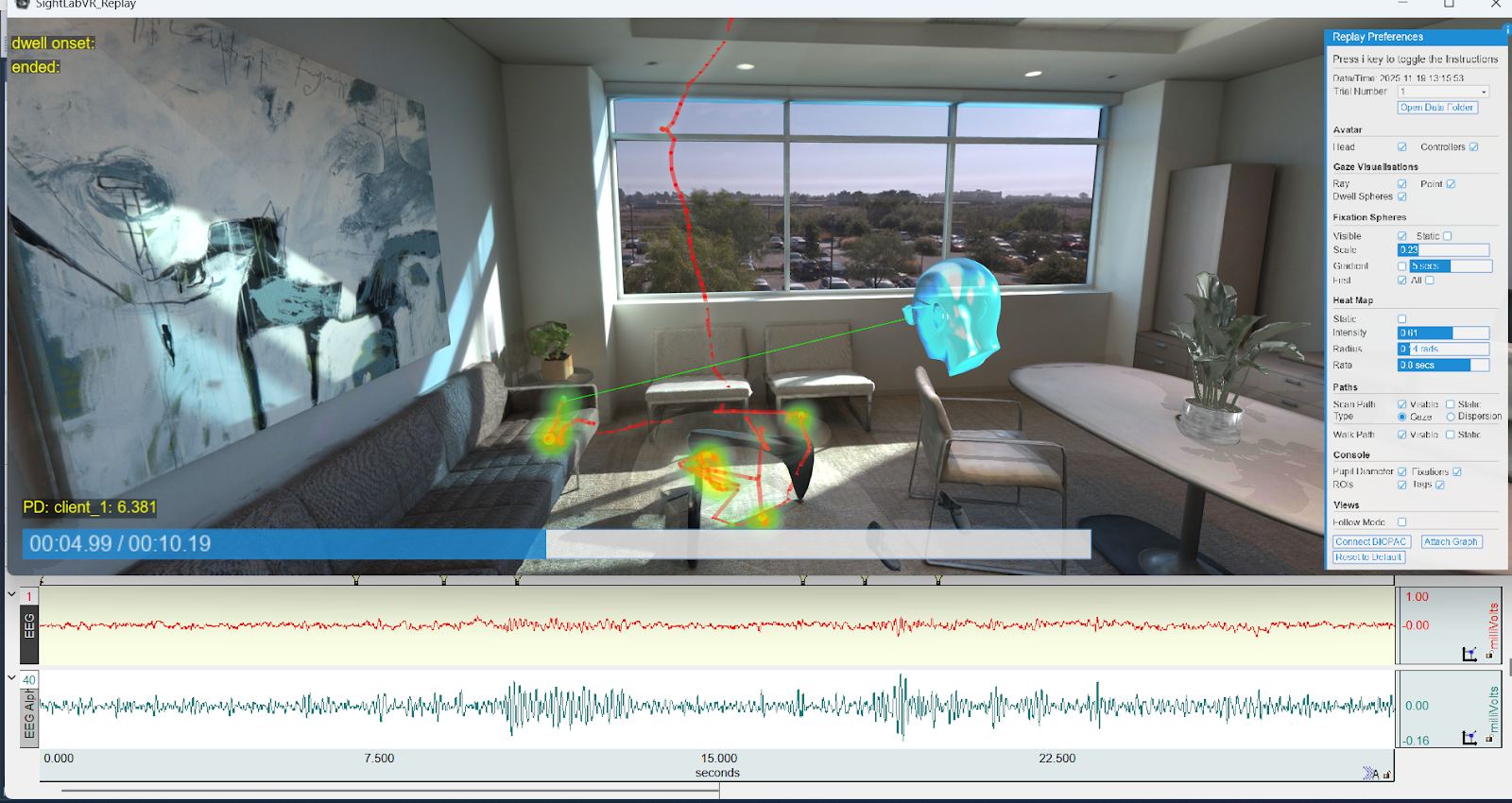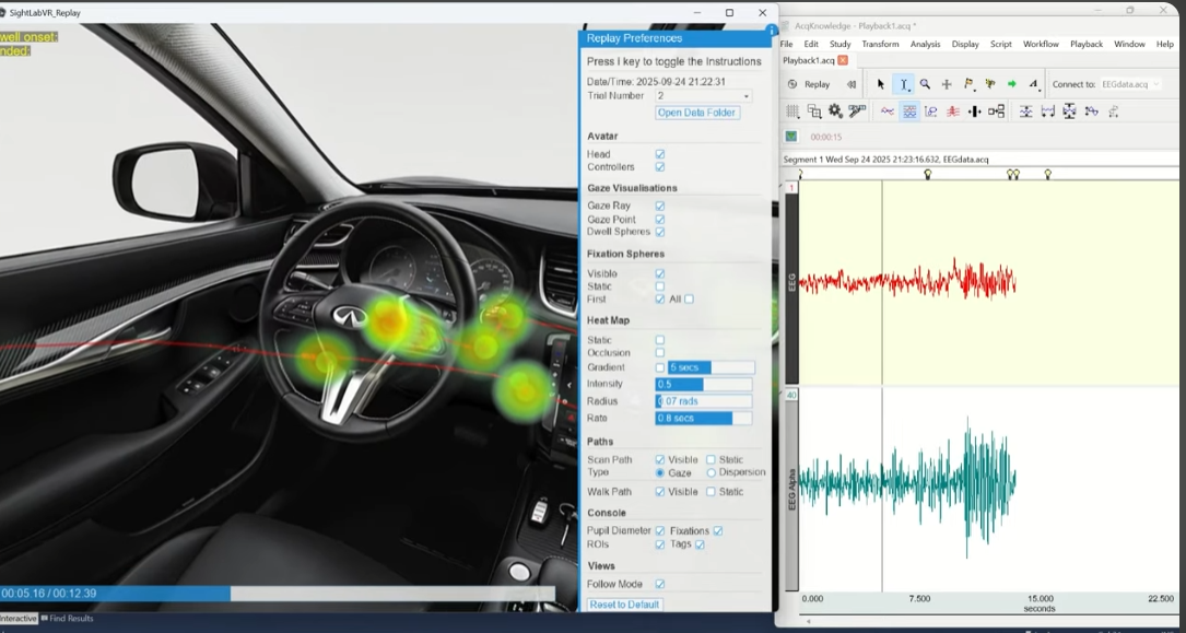 You can also adjust what is displayed using SightLab’s replay visualization tools - sliders, toggles, and visibility controls for gaze paths, fixations, dwell spheres, and more. This allows you to seamlessly inspect physiological signals and VR behavior data together, frame-aligned.
