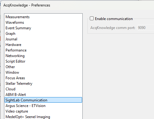 First in Acqknowledge, go to Display - Preferences and make sure "SightLab Communication" and NDT are checked on. Click "Enable Communication" to toggle on this feature.
